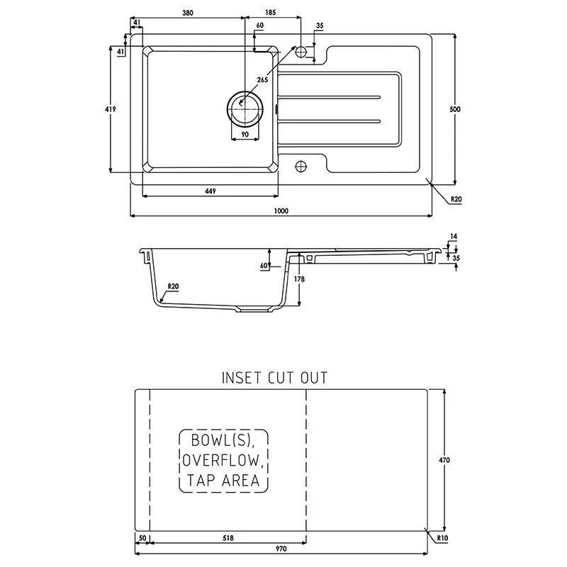 - Main Bowl Dimensions: W 449 x D 415 x H 178mm