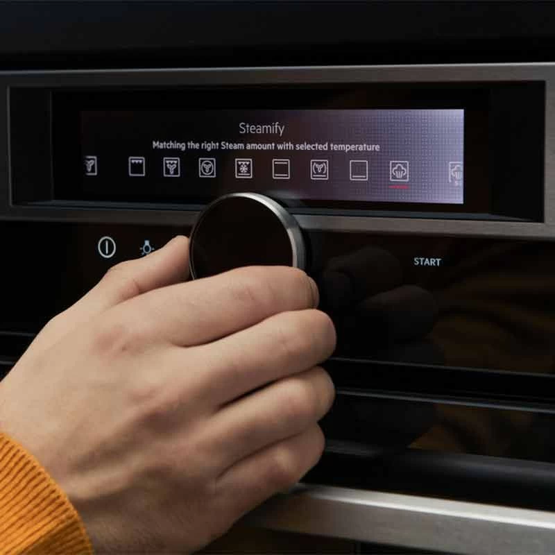 The AEG BSK999330T single electric oven is finished in an eye catching matt black. This oven is controlled using the command wheel and TFT controls. Alongside this the user is capable of connecting to the oven via the AEG smart phone app which allows the user to view the inside of the oven via the cookview camera. The user can also control the oven via the app. This oven is supplied with 3 different steam levels to allow for the ideal cooking results every time. The steam variations also clean the inside of the oven to reduce maintenance time of your kitchen. Consider this hi tech oven for your kitchen today.