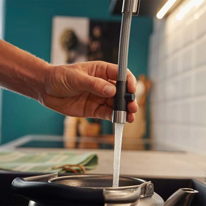 - Pull-out metal tap head on a flexi-hose