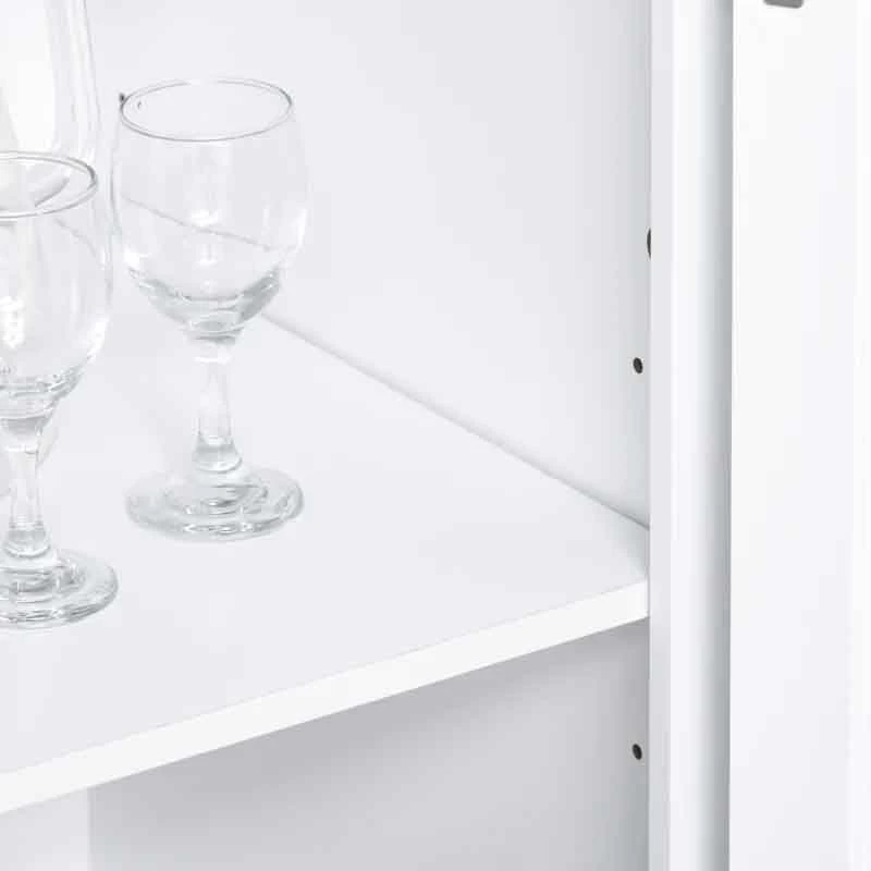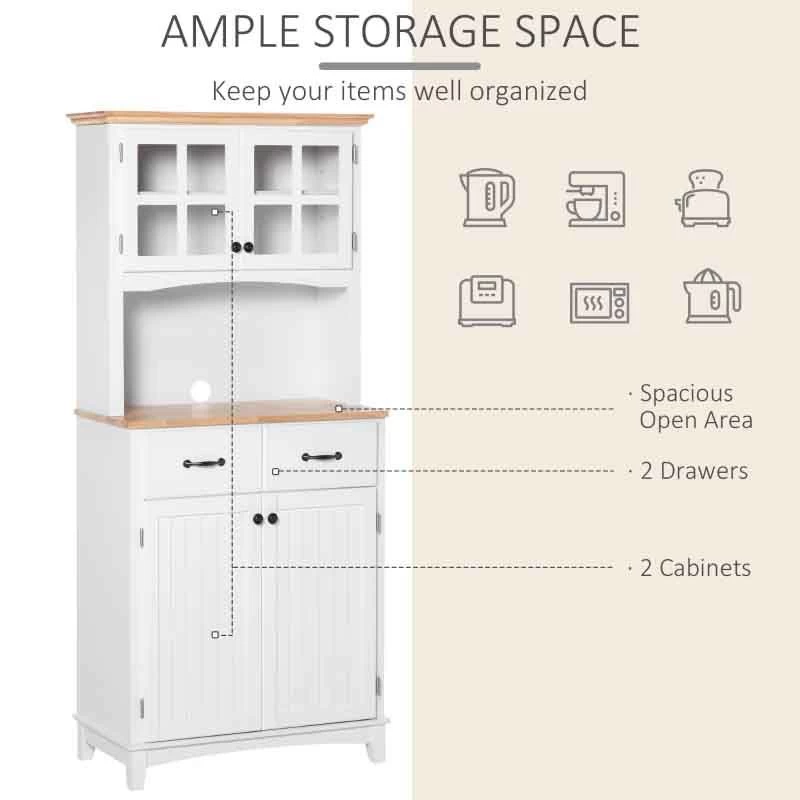 This HOMCOM storage cabinet provides ample kitchen storage space with doors and shelves. The upper cabinet stores plates or collections, while the lower cabinet holds larger items like coffee machines and toasters.
