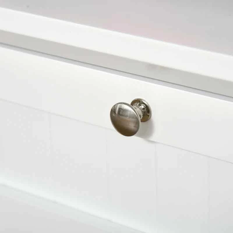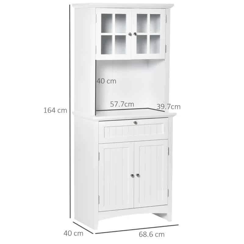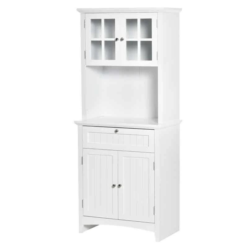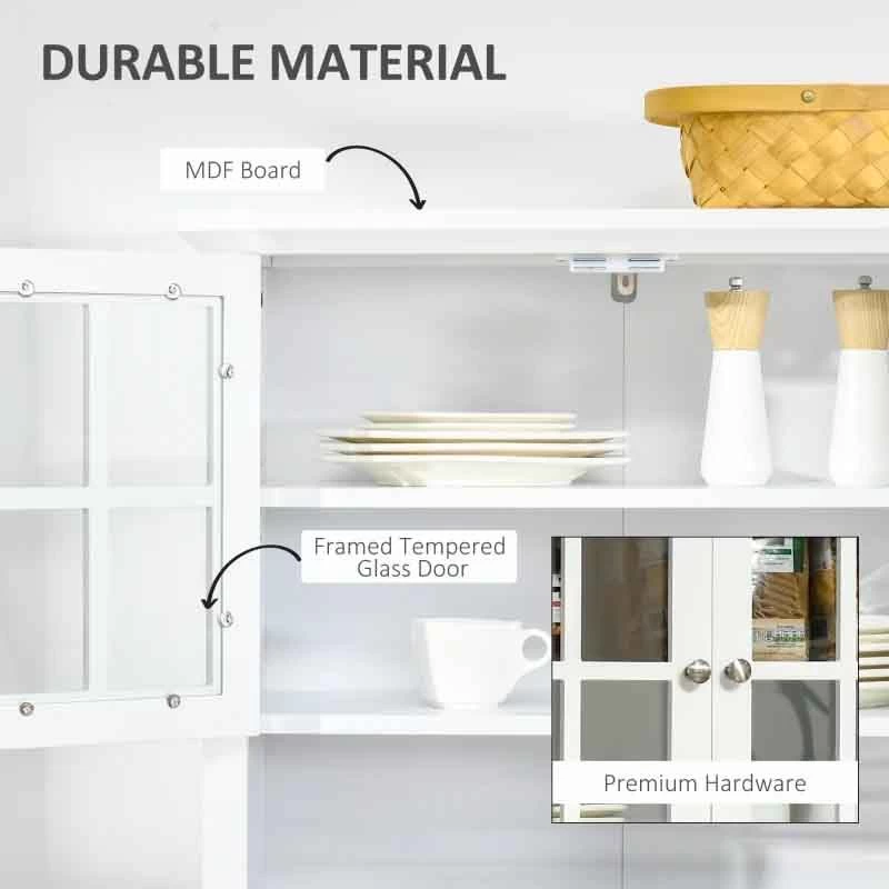 This HOMCOM freestanding kitchen cabinet offers ample storage space with two separate cabinets, an open middle area, and a wide drawer. The top cabinet features glass panel doors for easy visibility, while both spaces have adjustable shelves. The MDF structure is durable, finished with a smooth coat of paint and anti-tipping straps for safety.