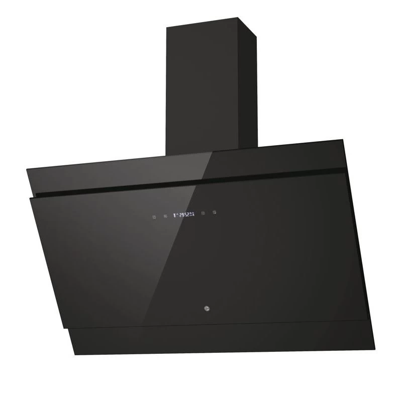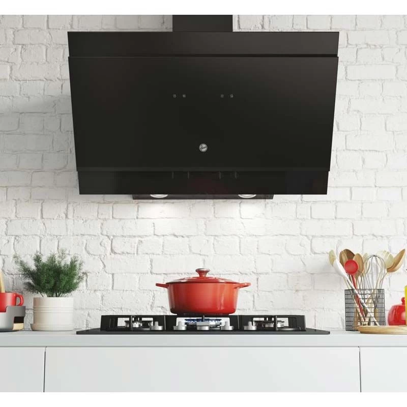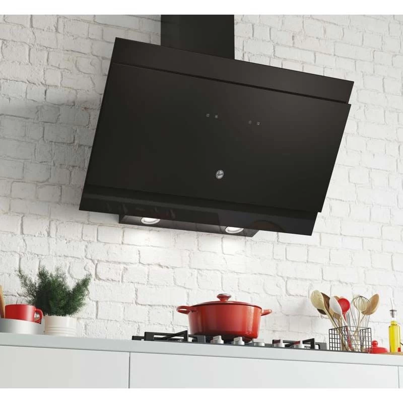 Elevate your kitchen with the Hoover HDG6DCK3BWIFI Wall-mounted Chimney Cooker Hood. Its elegant design in black, featuring LED lighting and a matte black body with black tempered glass, adds a modern touch to your space.