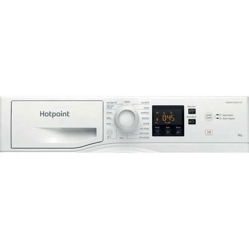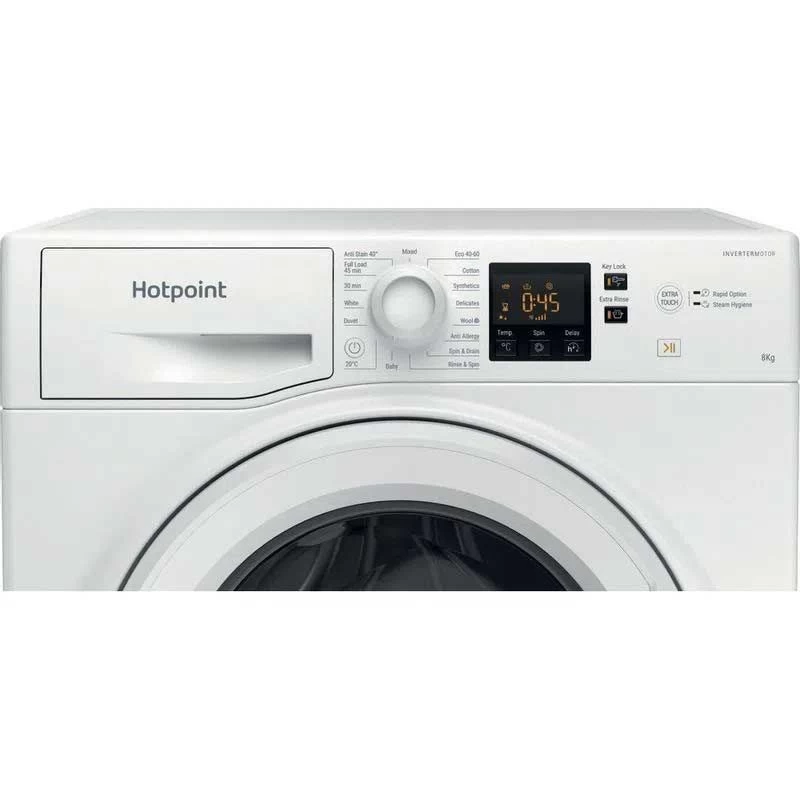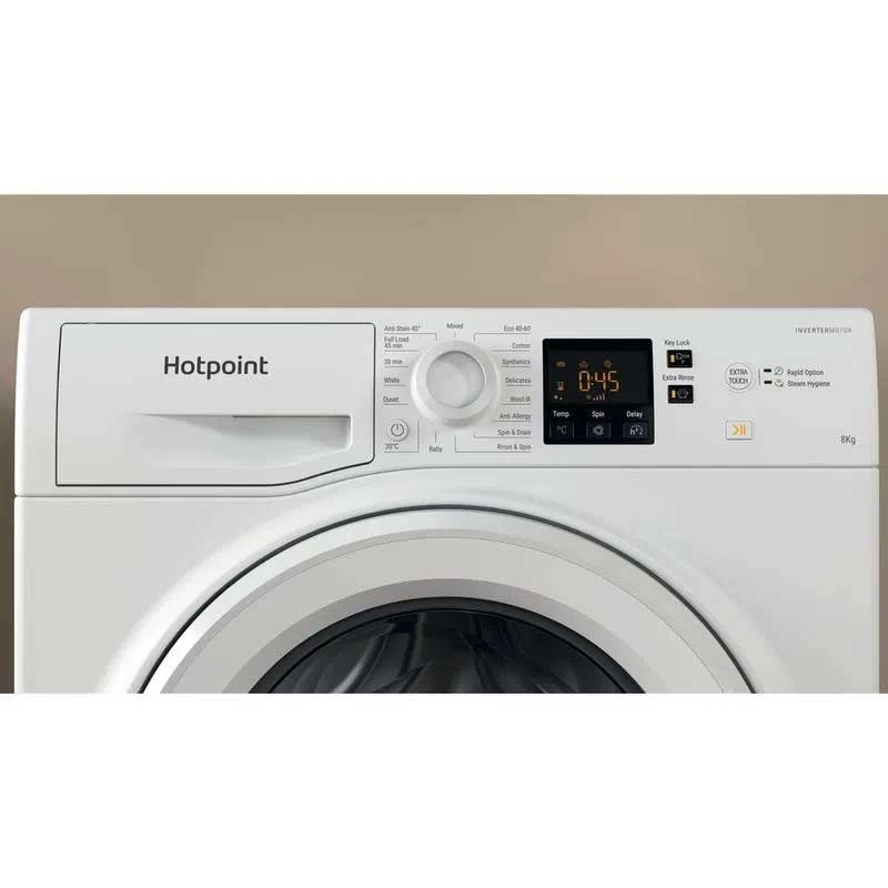 This White Hotpoint NSWF 845C W UK N 8kg Washing Machine will help you breeze through your laundry by tackling everday tough stains. Featuring a generous 8kg capacity makes it an ideal choice of mid – large family sizes, providing ultimate care and protection for all fabric types and loads. Steam Hygiene gently steams and tumbles your clothes at the end of a cycle so they can stay clean, hygienic and fresh; free allergens and bacteria.