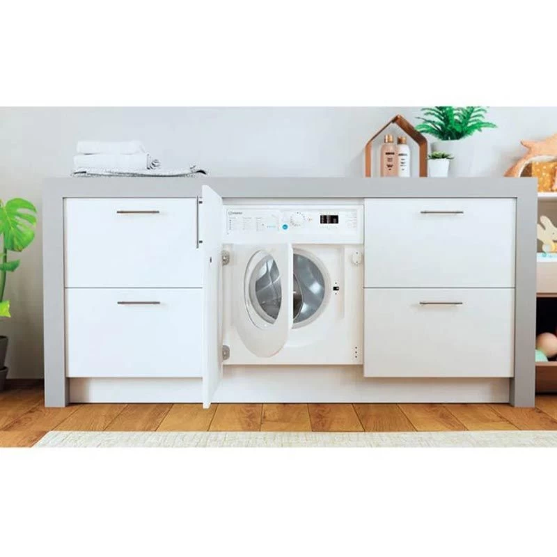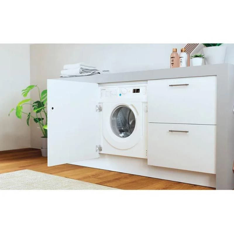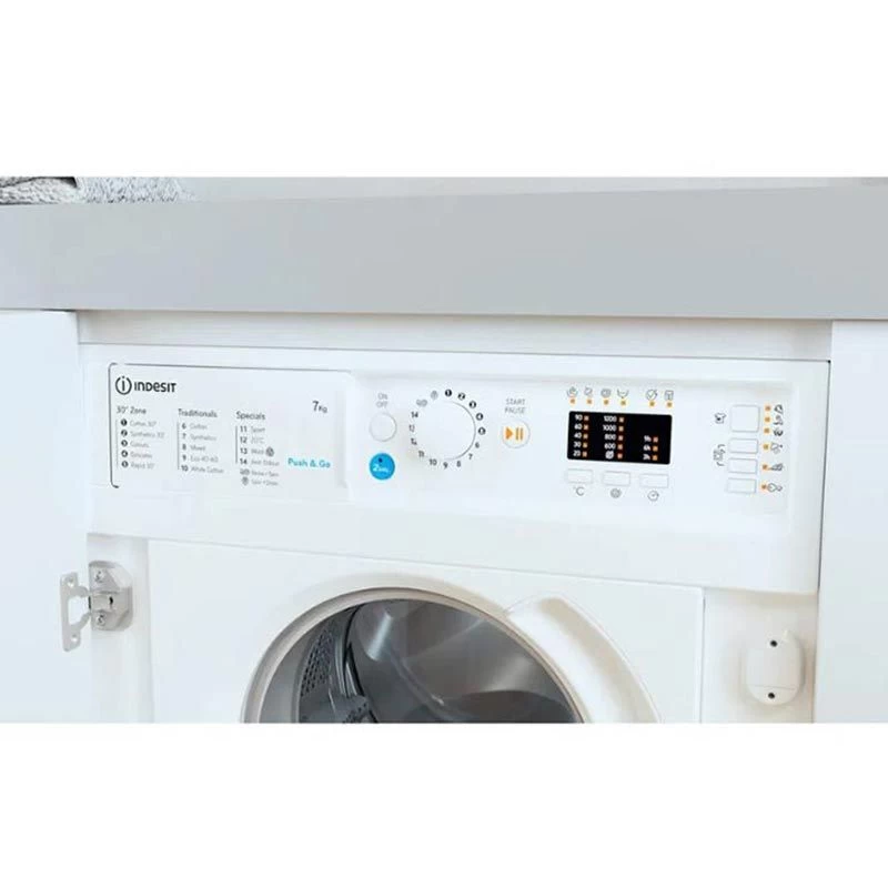 This white Indesit integrated washing machine, great for larger families who have lots of laundry. This white washing machine can wash loads of up to 7kg. This model comes with multiple wash programmes, featuring the innovative Push&Go programme, With Indesit’s Push&Go technology. Simply press and hold the dedicated button for 2 seconds, and the machine will automatically start a 45 minute 30°C cycle that’s perfect for cottons and synthetics. This washing machine is fitted with water balance plus, this adapts the amount of water used according to each cycle’s need, ensuring minimal wastage which will help you to save money on your energy bills. This washing machine is designed to be fitted behind a cabinet door for a uniform kitchen design.