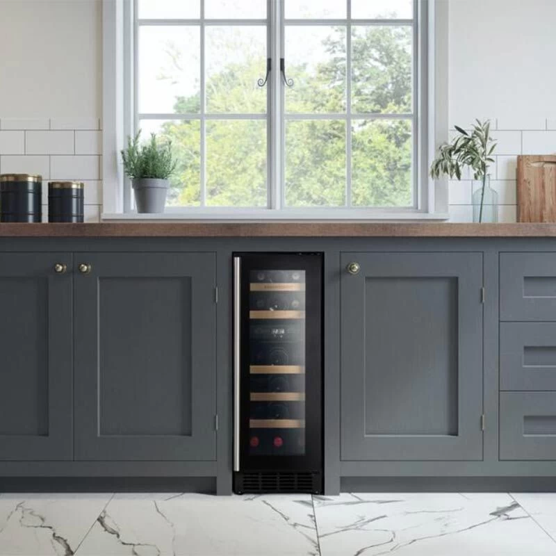 This 30cm Rangemaster wine cabinet cooler has an 18 bottle capacity and 5 glide-out premium wooden shelves for easy access. The dual temperature zones for two different internal temperatures, one in the upper section and one in the lower, allow you to enjoy all wines at the perfect temperature. With triple glazed doors, UV filtered glass to protect the wine from the sun’s harmful rays and an anti-vibration system to avoid disturbing sediment, Rangemaster wine cabinets provide the optimal environment to store your wine.