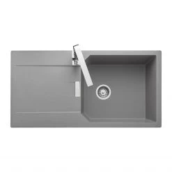 The Rangemaster Mayon 1 Bowl Igneous Granite Reversible Inset Kitchen Sink features sharp geometric bowls and a smooth drainer design, with a sleek chrome branded overflow cover adding a premium finish to the overall sink design. The Mayon range is composed of 3 options; single bowl in standard and ultra compact sizes and a 1.5 bowl option.